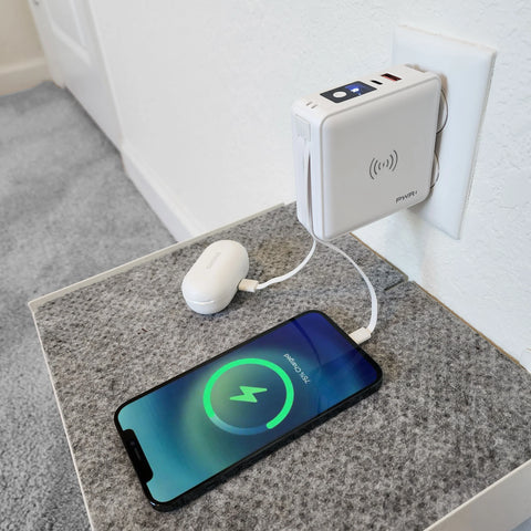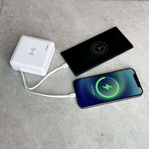 Travel 5 in 1 Power Bank is the perfect travel charger, a 5 in 1 power bank that provides unmatched versatility. With its robust 10,000mAh battery, it offers extended usage time for your devices. It features a built-in lightning cable for Apple devices and a USB-C cable for Android devices, catering to a wide range of charging needs. The fast PD 20W USB-C technology allows you to charge your PD enabled device up to 50% in just 30 minutes, ensuring rapid and efficient charging. In addition to all that the Travel 5 in 1 Power Bank also provides 15W wireless charging for your phone or airpods, making it the ideal option for travel and daily use.